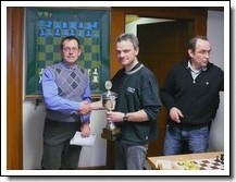 Folglich kam es in der abschließenden fünften Spielrunde zum direkten Aufeinandertreffen der beiden punktgleichen Spieler Hans-Erich Gubela sen. und Titelverteidiger Frank Pluschke. In einer interessanten Angriffspartie erstürmte der für Oberkirch spielende Landesligaakteur die gegnerische Königsstellung und erzwang so die Spielaufgabe seines Kontrahenten. Mit diesem Erfolg hat Frank Pluschke nunmehr zum dritten Mal in Folge das inzwischen traditionelle und sehr beliebte Achertalturnier gewonnen. Als Preis durfte er durch den Vorsitzenden des SC Ottenhöfen-Seebach, Michael Armbruster, neben der Pokaltrophäe eine angemessene Siegprämie entgegennehmen.