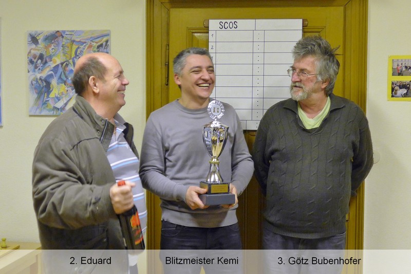 Sieger, und damit neuer Achertal-Blitzmeister wurde hier verdientermaßen Kemi Mestan mit 18 von 20 möglichen Punkten. Er gewann vor Eduard Braun und Götz Bubenhofer. Auch sein Sohn Kadir, unser Nachwuchstalent aus der Jugendabteilung, zeigte eine gute Vorstellung bei dem Turnier.